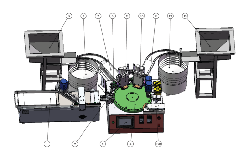 ⑾轧盖机构 ⑿外盖振动盘 ⒀外盖料仓 ⒁出料托盘